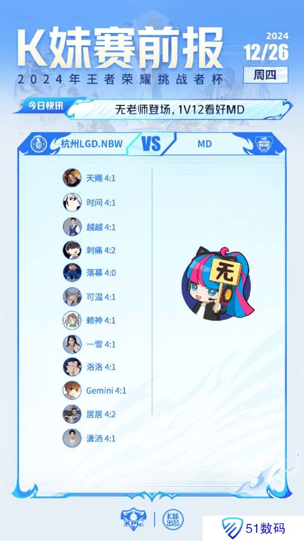 LGDNBW对战MD :无老师首战登场,1v12看好MD;
