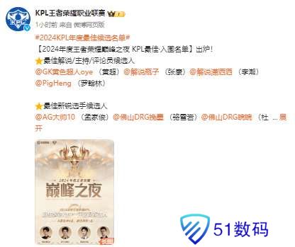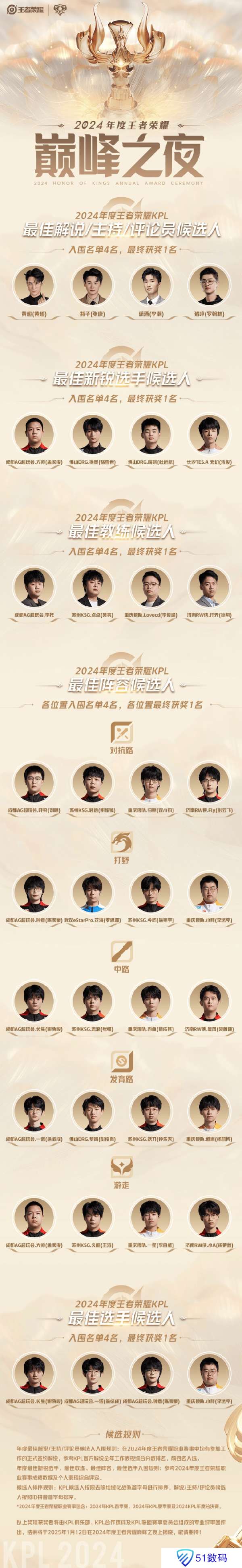 2.年度最佳新锐选手、最佳教练、最佳阵容、最佳选手入围规则:参考2024年度王者荣耀职业赛事成绩数据及个人表现综合评定,2024年度王者荣耀职业赛事包含:2024年KPL春季赛、2024年KPL夏季赛及2024KPL年度总决赛