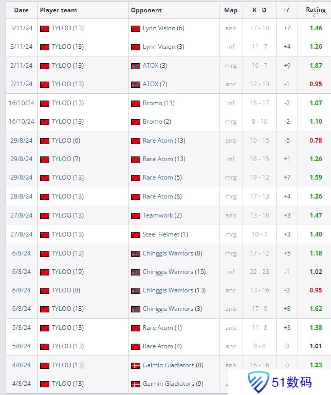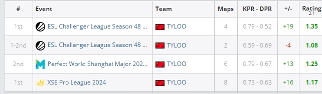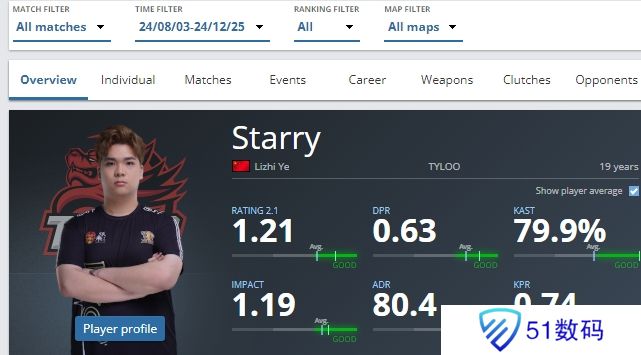Starry在8月份转会至TYLOO到如今回归LVG,也不过短短5个月,在此期间他们总计参加了4个赛事。Starry转会之后持续着个人良好的竞技状态,在为TYLOO效力期间能贡献平均1.21 rating。