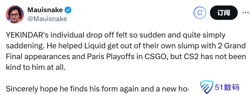 Mauisnake:YEKINDAR个人状态的下滑来得如此突然,实在令人惋惜。在CS:GO时期,他助力Liquid战队摆脱低谷,两次闯入总决赛,还打进巴黎Major淘汰赛,但CS新版本对他实在不太友好。