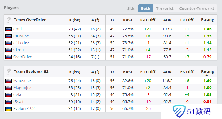 表演赛为BO3。kyousuke即使是在对阵donk、m0NESY,仍拿到了76的最高击杀数、1.60的最高Rating、82%的最高KAST和116.2的最高回合平均伤害。