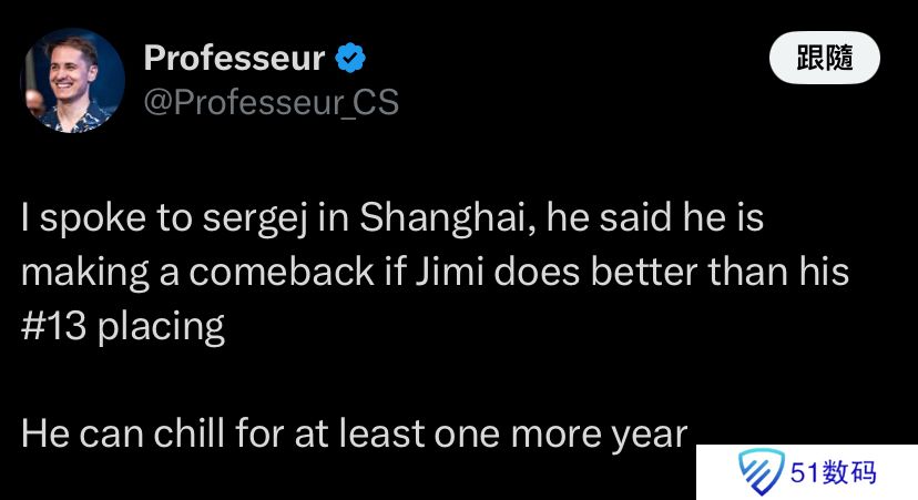 HLTV编辑Professeur:我在上海和sergej(Jimpphat的哥哥)进行了交谈,他表示如果Jimpphat的排名超过他的TOP13,他将会复出。现在他至少可以再放松一年了。