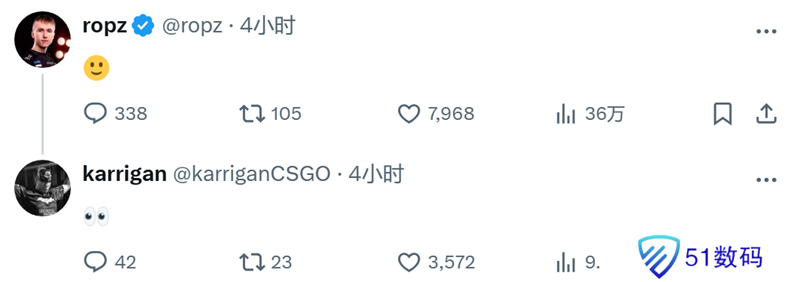 FaZe指挥karrigan也在评论中发布了“眼睛”的表情,ropz本人则也回复了同样的表情。