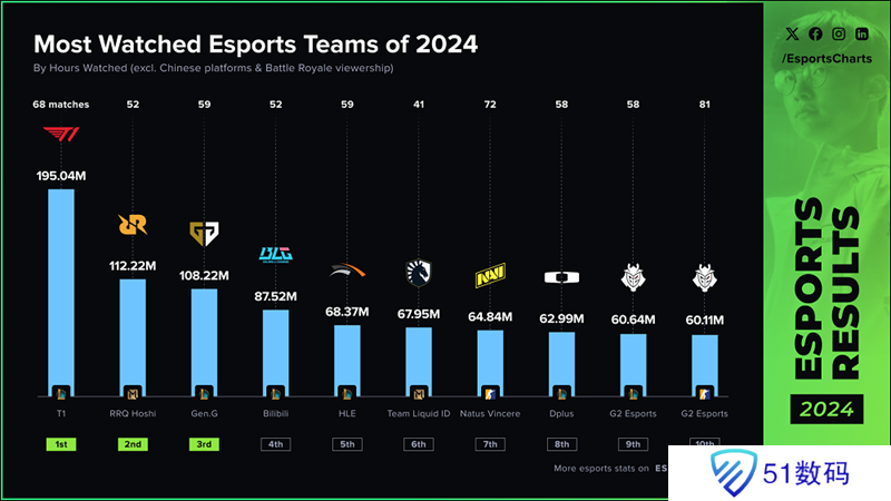 2024年最受关注的电竞战队是英雄联盟S14世界总决赛冠军T1。他们在本赛季的比赛创造了超过195,000,000小时的观看时长(HW)。