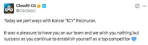 Cloud9官宣与队内狙击手ICY分道扬镳。