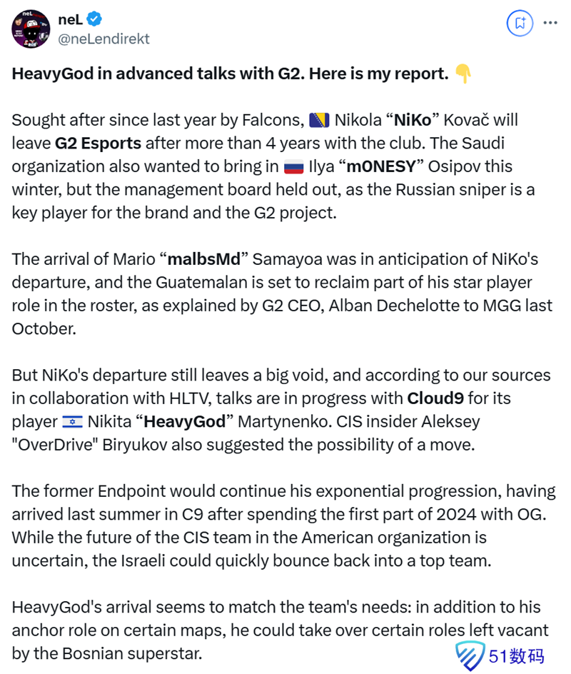 然而NiKo的离开仍留下了巨大空缺。据我们与HLTV合作获取的消息源称,G2正在与Cloud9就其旗下以色列选手HeavyGod的转会进行谈判。独联体地区的爆料人OverDrive也暗示了这一转会的可能性。