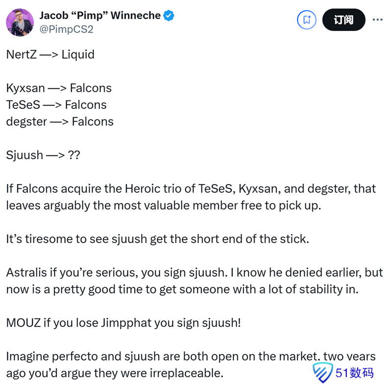 Astralis,如果你们是认真的,就签下sjuush。我知道他之前拒绝过你们,但现在是引入一名极具稳定性选手的绝佳时机。