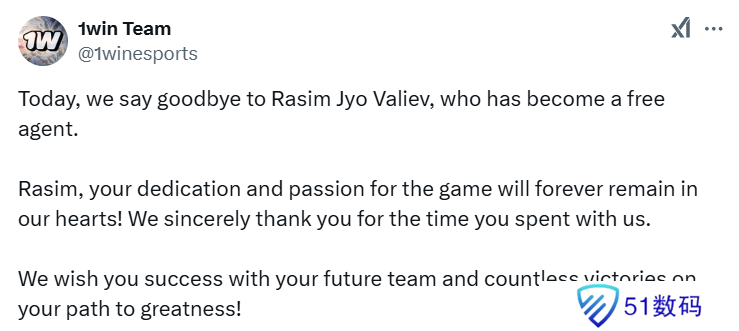 1WIN战队在社交媒体上官宣,将于队内指挥Jyo分道扬镳,后者目前是自由选手。