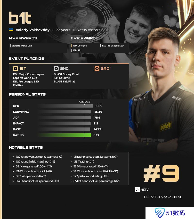 Valeriy Vakhovskiy | b1t在年度Top20选手榜单中追平了个人最佳排名——第9名。此前,他不仅斩获了职业生涯首个MVP奖项,还凭借一系列出色表现给人留下了深刻印象。