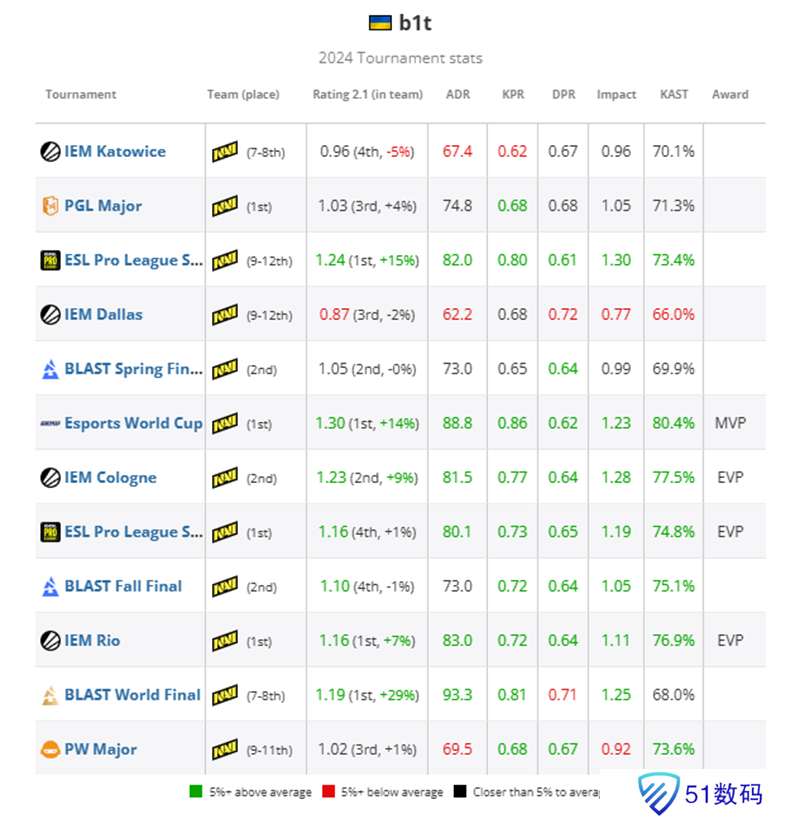 Natus Vincere在 2022年仅赢得了一项赛事——BLAST春季总决赛,但在Boombl4离队前,他们依然表现出色,分别在PGL 安特卫普 Major和IEM科隆站中获得亚军。而b1t在这几项赛事中均获得了 EVP。
