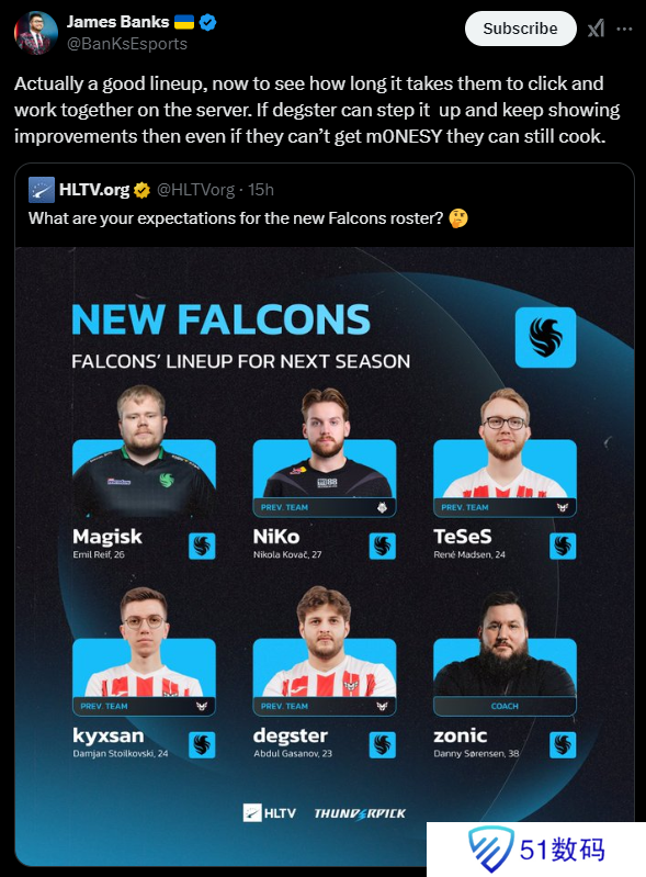 Falcons签下kyxsan、degster和TeSeS三名选手补全阵容后,知名解说BanKs在个人社交媒体账号上分享了自己对该阵容的看法。