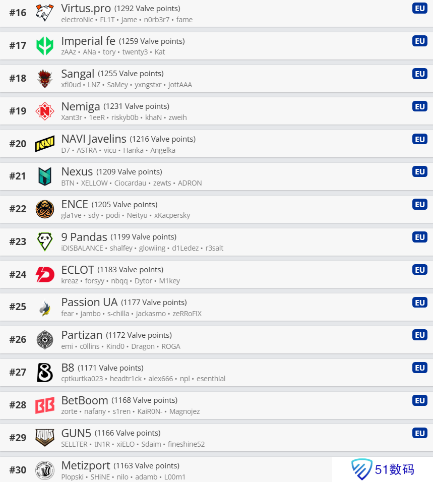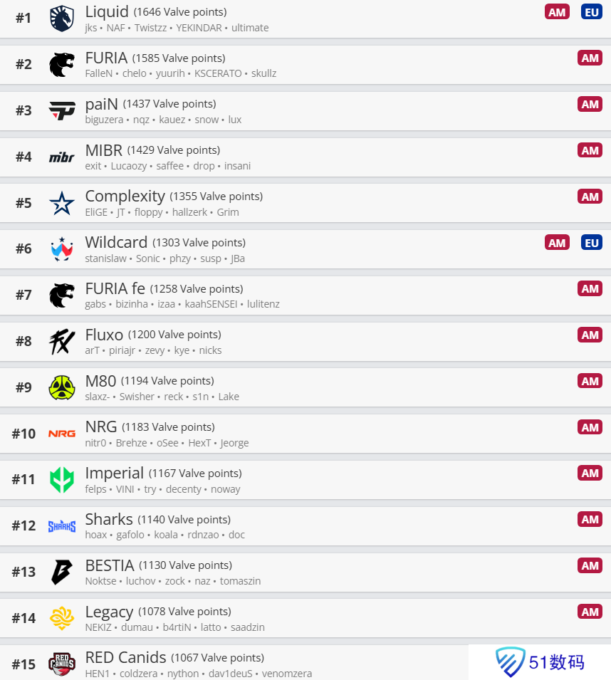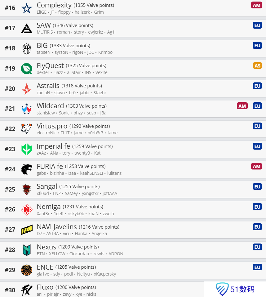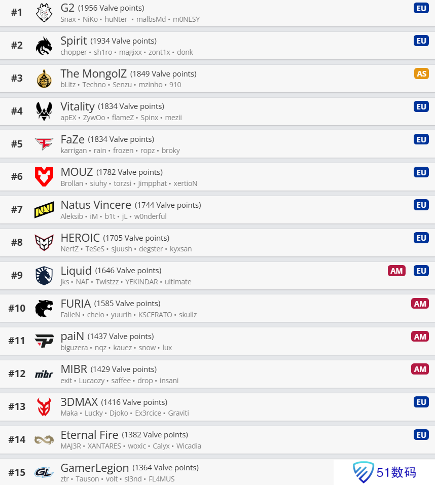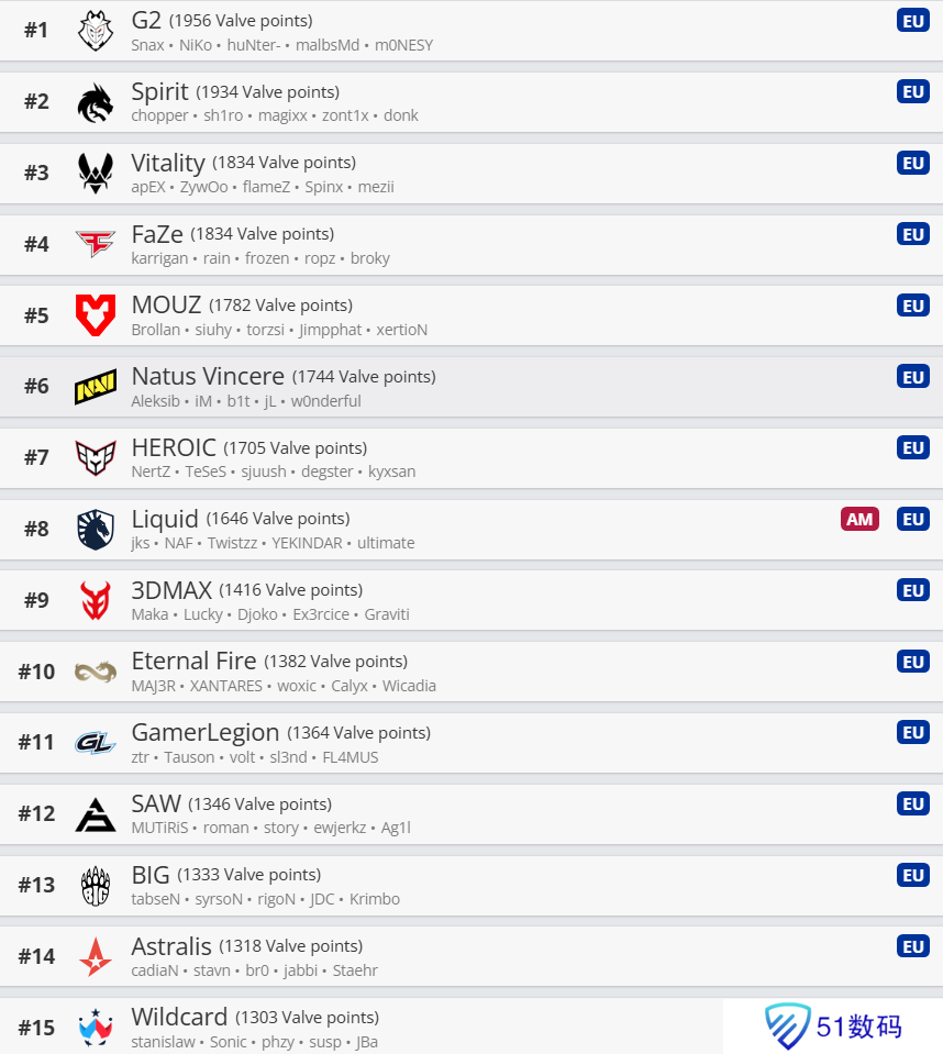 Natus Vincere战队因在上海Major未能进入淘汰赛,下滑至第7位。