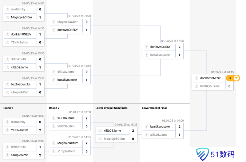 donk和m0NESY的队伍赢得了12万美元奖金,donk还被选为MVP,此外,donk和m0NESY还因刀杀各获得了5000美元奖励。baz和kyousuke的队伍获得亚军,赢得了6万美元。