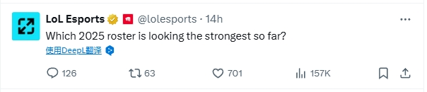 LoLesports官推发文,“目前为止,2025赛季的哪队阵容看起来最强?”