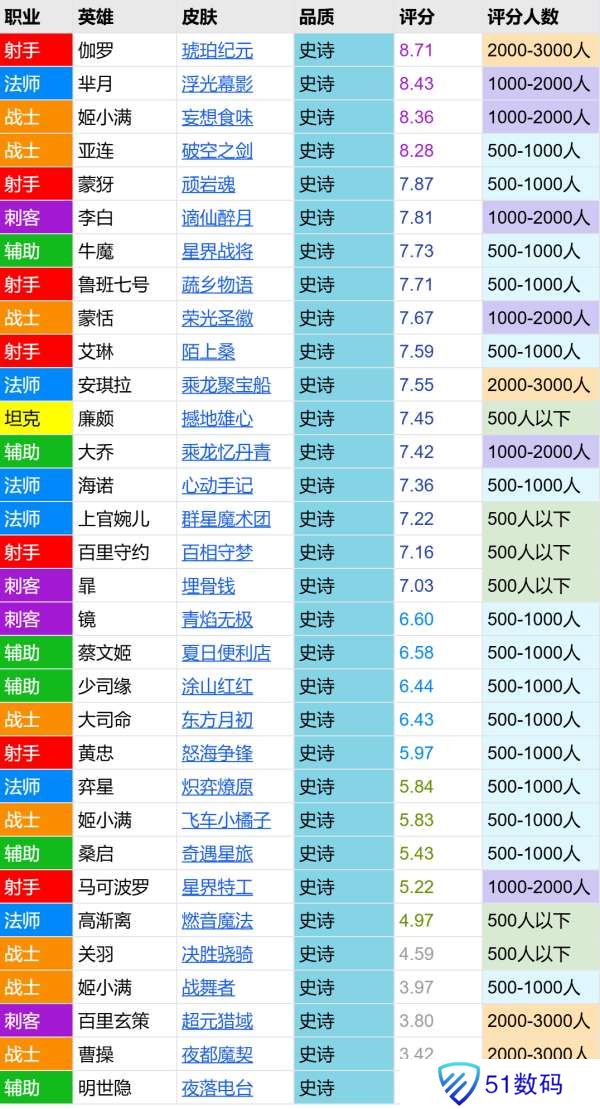 24年至今共上架评分32款史诗皮肤,总体质量较差,平均分仅有6.55分。飞车小橘子的分数和弈星KPL皮极为接近,排在倒数第九位。
