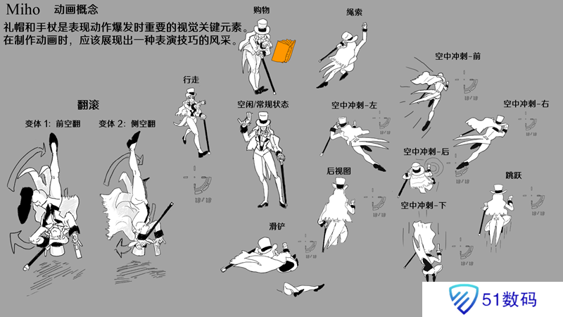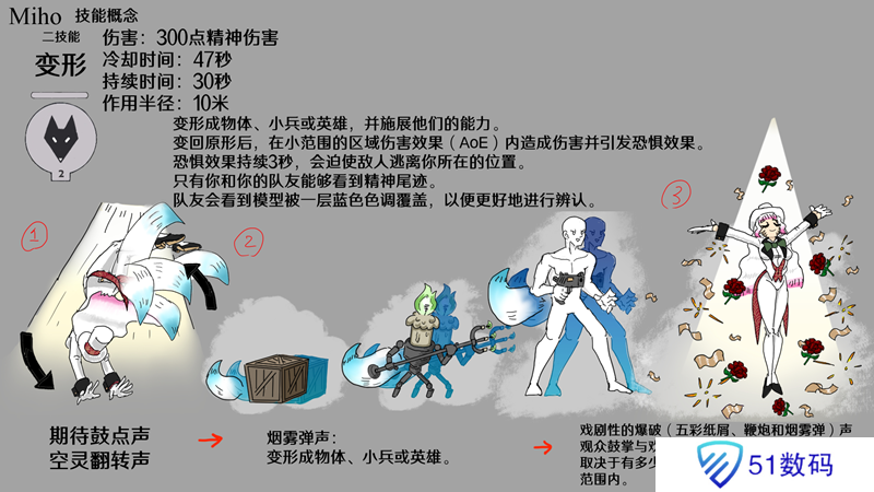 因为这个角色是基于魔术师和艺人,我认为英雄在四处走动时有表演技巧是最重要的。