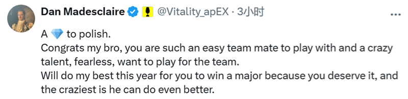 今年我会竭尽全力,助你拿下Major冠军,因为这是你应得的。最厉害的是,他还能表现得更出色。