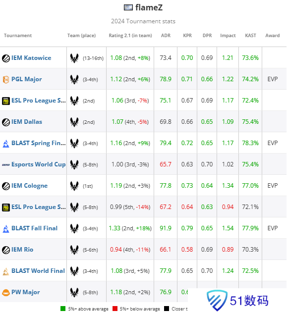 Virtus.pro后早早出局,flameZ今年首次错失VP或EVP提名,最终rating为1.00,五张地图中有三张表现不佳。