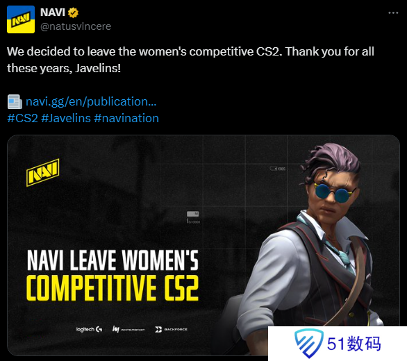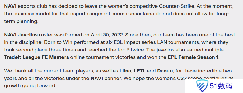 “NAVI电子竞技俱乐部已决定退出女子反恐精英竞技项目。目前,该电竞领域的商业模式似乎难以为继,无法进行长期规划。