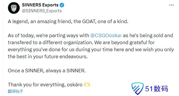 “非常感谢你在这里的努力与贡献。祝愿你未来一切顺利,”SINNERS在社交平台上表达了对oskar的感谢。