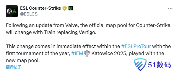 这一变化立即生效,将在#ESLProTour中实施,2025年首场赛事IEM 卡托维兹将使用新的地图池进行比赛。”