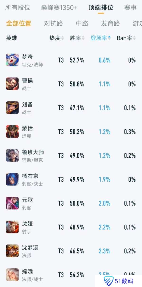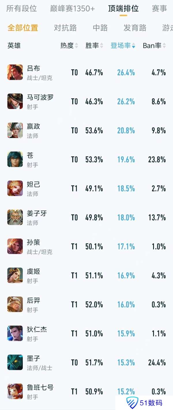 吕布、马可波罗、嬴政、苍、妲己位居前五,前十有五名发育路英雄。