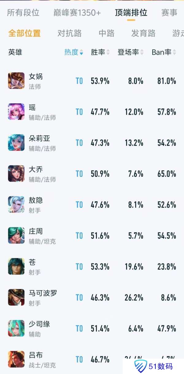 女娲、瑶、、朵莉亚、大乔、敖隐位居前五,游走位前十中占据五个位置;