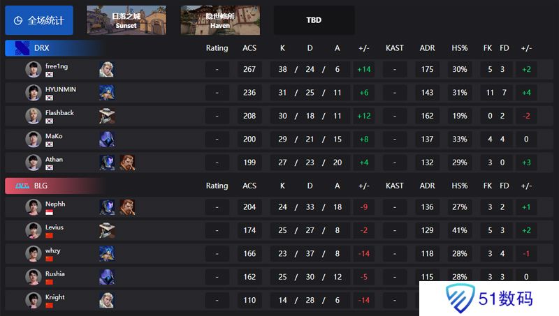 源能亚洲邀请赛瑞士轮第一轮,DRX直落两图击败了BLG。图一日落之城,DRX 13:11 BLG,图二隐世修所,DRX 13:2 BLG。值得一提的是,free1ng选手拿到了全场最高的38总击杀,DRX也是全员KD为正,反观BLG则全员负KD。