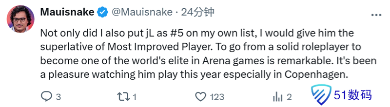 Mauisnake:我不仅在自己的榜单中将jL排在第5位,我还会授予他“进步最大选手”这一殊荣。从一名出色的团队型选手成长为竞技场比赛中的世界顶尖选手之一,这非常了不起。今年观看他比赛,尤其是在哥本哈根的赛事,真的令人愉悦。