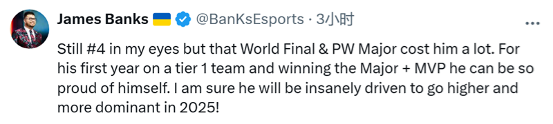 Banks:在我看来他应该排第四,但世界总决赛和上海Major让他失分不少。作为他在顶级战队的第一年,就赢得了Major冠军并获得MVP,他完全可以为自己感到骄傲。我相信,2025年他必定会疯狂地朝着更高目标奋进,力求展现更强的统治力!