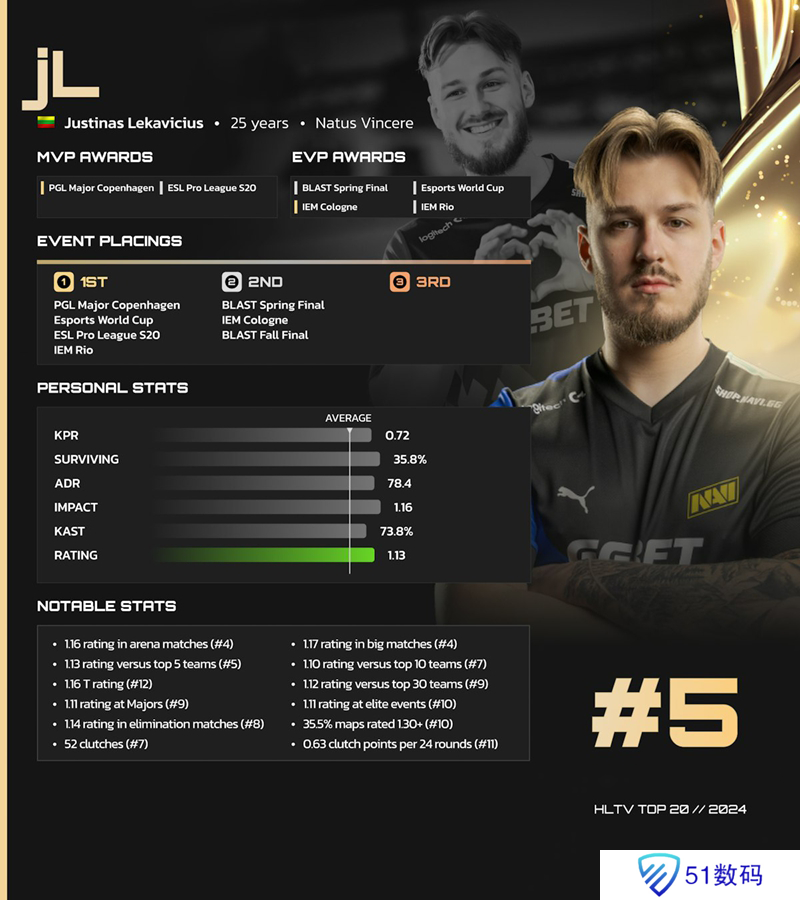 jL凭借在哥本哈根Major(他的Impact为NAVI赢得了Major)和EPL S20上的MVP级表现跻身前五。此外,他还获得了四项大型赛事的EVP,其中包括著名的IEM 科隆站。他2024年的履历让他稳居前六。