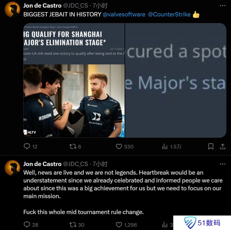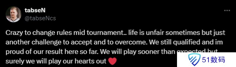 tabseN:比赛期间调整规定太疯狂了。生活有时并不公平,但这是我们另一个需要接受和克服的挑战。我们依然成功晋级Major,而且我为我们取得的结果感到自豪。接下来的比赛将比预期更早,但我们肯定会全力以赴。