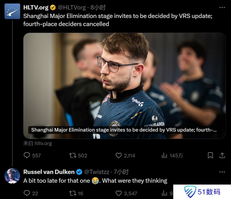 在昨晚上海Major主办方宣布,他们接到了V社的通知。上海Major正赛排名将由VRS确定,第四名争夺战取消。RMR B组将不进行第四名争夺战,RMR A组已进行的第四名争夺战将被取消。这一改动很可能不会影响RMR A组的结果,即四支热门战队都已经进入了正赛阶段,但却对RMR的公正性提出了严重质疑,因为赛事中期的规则变化影响到了RMR B组中爆冷的弱旅们。两支赛前不被看好的队伍