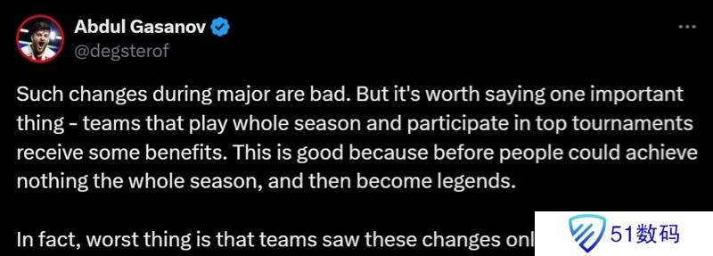 degster:在Major期间出现这样的改动很糟糕。但有一点很重要,那就是参加整个赛季和顶级赛事的队伍都会得到一些好处。这是件好事,因为以前人们可以在整个赛季中一无所获,然后成为传奇组战队。