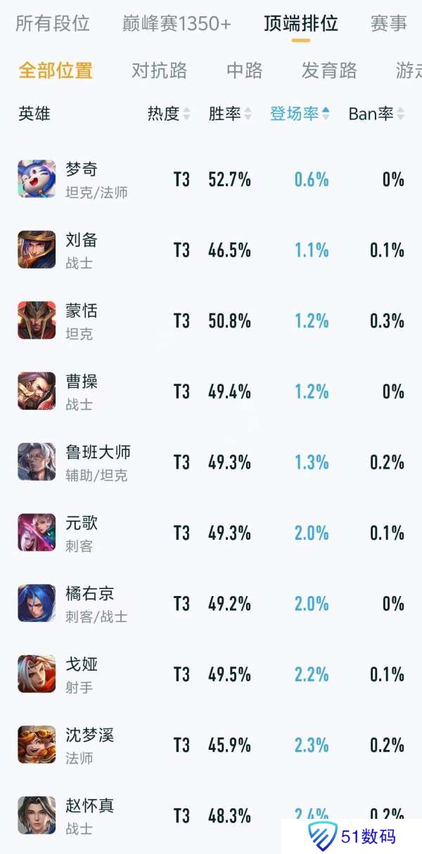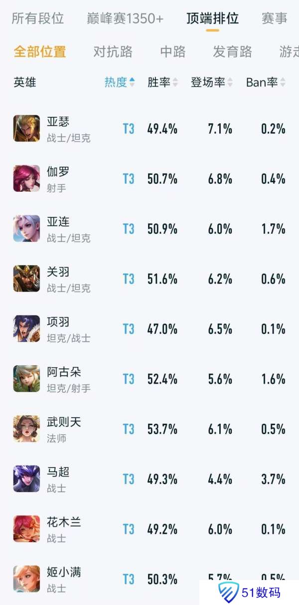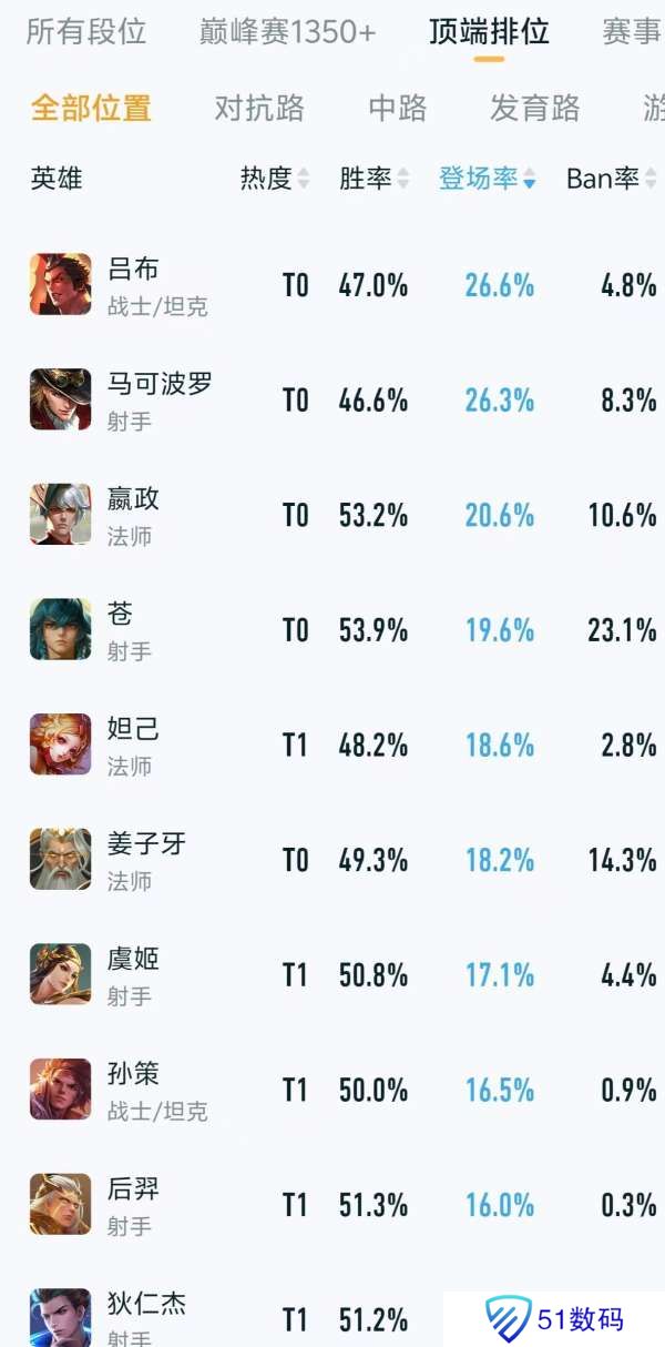顶端排位热度、出场率排行:亚瑟热度最低,吕布出场率第一