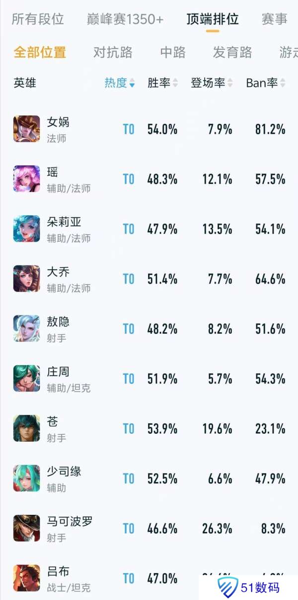 女娲、瑶、、朵莉亚、大乔、敖隐位居前五,游走位前十中占据五个位置,与前一日无变化;