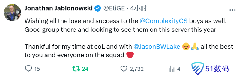 感谢我在Complexity战队度过的时光,也感谢@JasonBWLake 。祝你和战队里的每一个人一切顺利。”