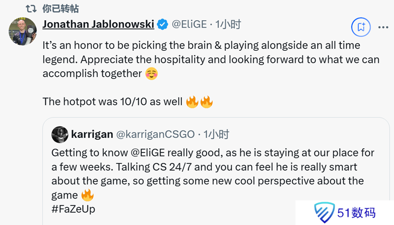 FaZe战队官宣签下EliGE作为战队新成员。而在今天karrigan在社交平台上发布动态,分享了自己和EliGE成为队友的感受。