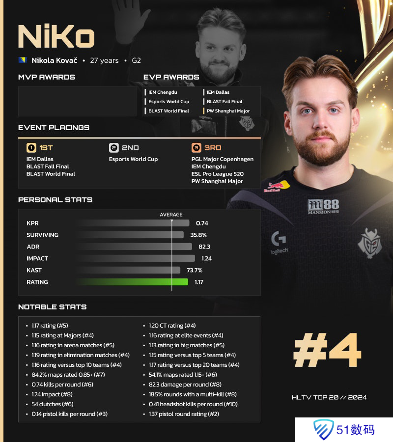 Nikola Kovač | NiKo在2024年又一次凭借自己的优异表现入选了TOP20选手榜单,同时打破了连续进入该榜单的记录。