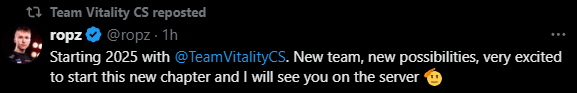 ropz:2025年从Vitality开始。新团队,新机遇,迎接这个新篇章使我非常兴奋,期待在赛场上见到你们。