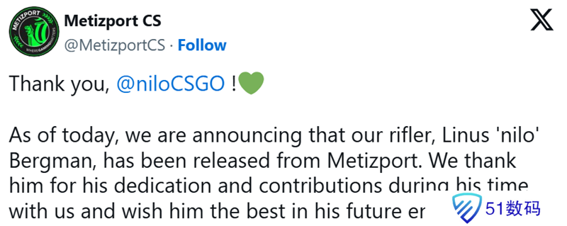 Metizport宣布同nilo分手,同时招入hampus及isak两名新成员,完成阵容组建工作。