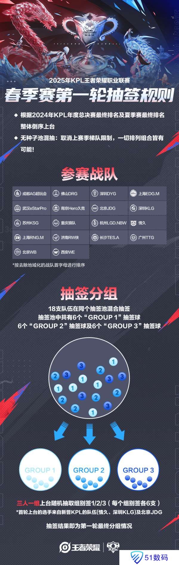 18支队伍在同个抽签池混合抽签,根据2024年KPL年度总决赛最终排名及夏季赛最终排名整体倒序上台;