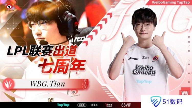 直播吧1月15日讯 今天是英雄联盟职业选手Tian登场LPL七周年纪念日,WBG官方发文送上祝福。