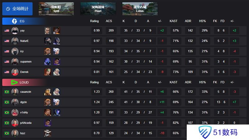 图一霓虹町,双方常规时间战至12平,通过一轮加时,LOUD 14:12 EG,图二深海明珠,上半场双方再次战至6平,并且下半场一度比分焦灼至10平,最终LOUD在关键时刻通过战术调整,一波3-0带走了比赛,比分定格在LOUD 13:10 EG。