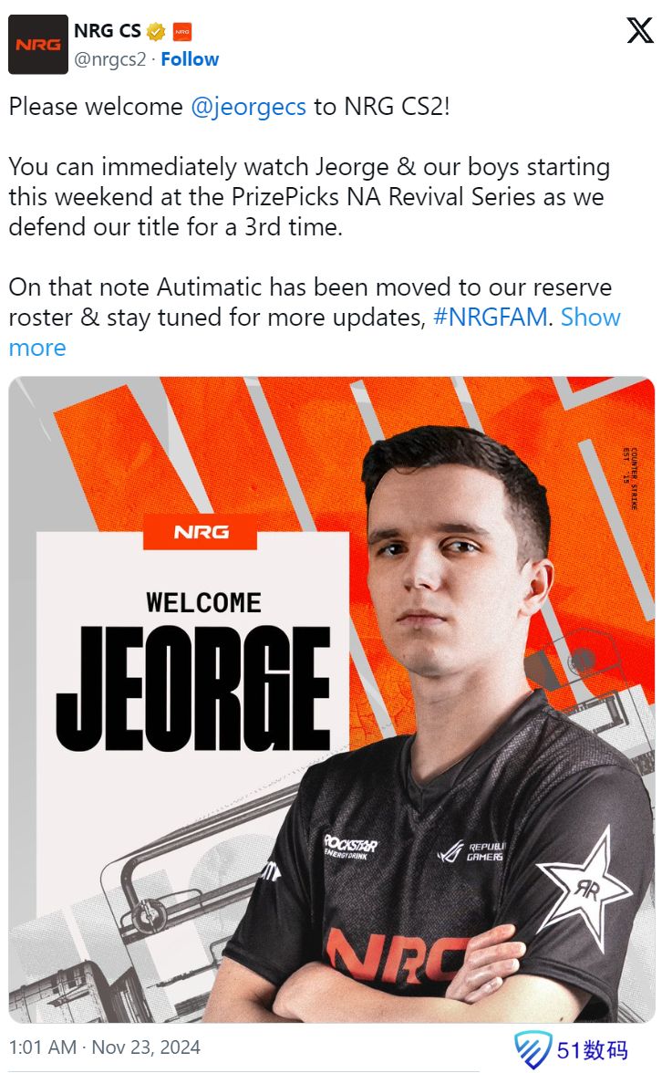 官宣:NRG签约Jeorge,下放autimatic