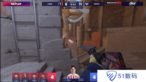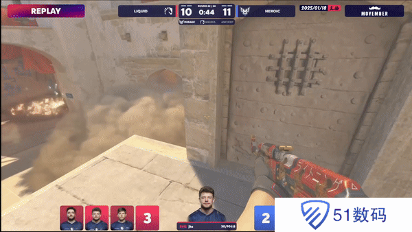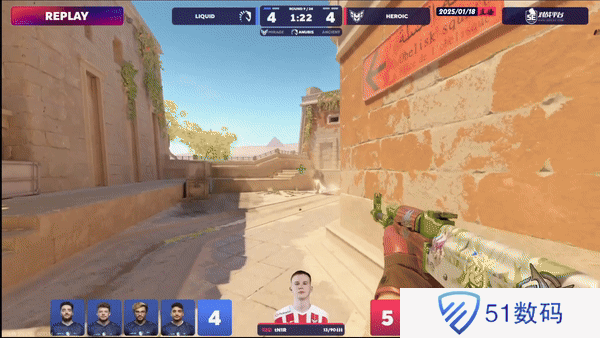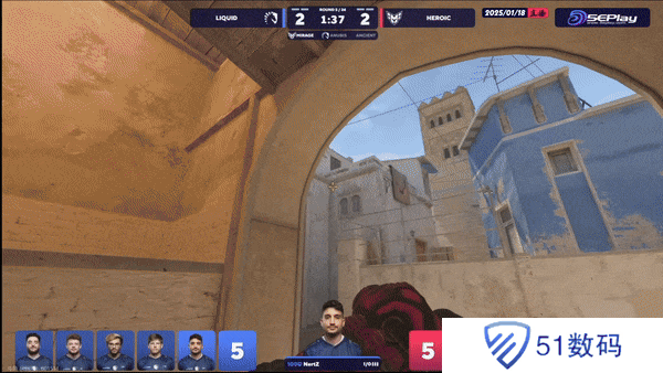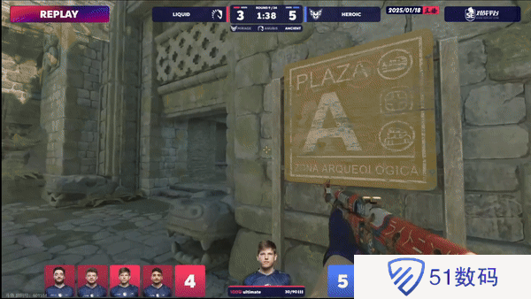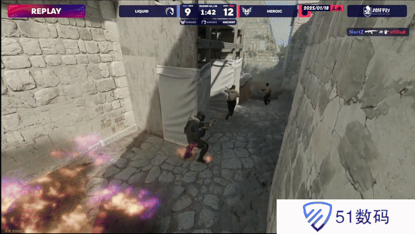 下半场攻守互换。液体选择拱门A1夹A但包点CT瞬秒A1,B小CT赶来缓解中路攻势,Heroic拿下下半场手枪局。