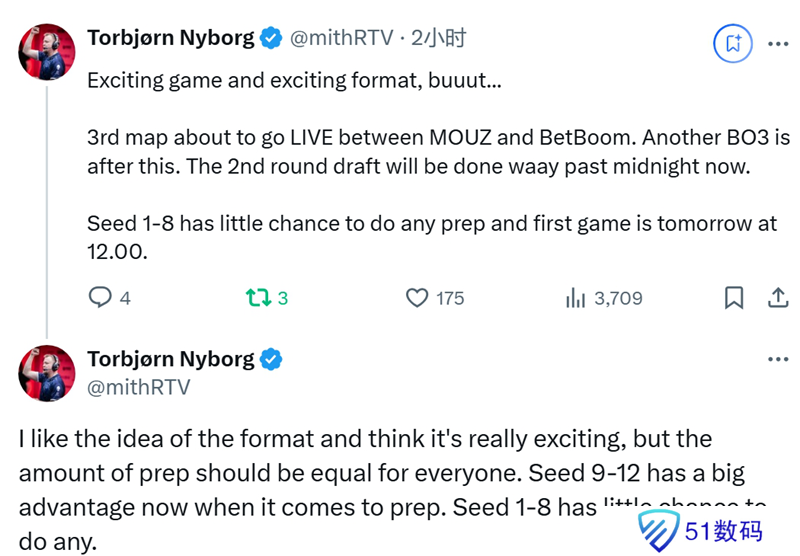 我喜欢这个赛制的创意,觉得它真的很刺激,但是每个人的准备时间应该是平等的。就准备情况而言,9-12号种子队现在有很大优势,1-8号种子队则几乎没什么机会准备。 ”