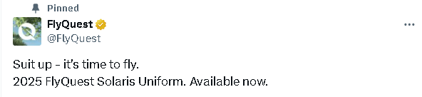 “穿好装备——是时候起飞了。 2025年FlyQuest Solaris战队制服。现已发售。”