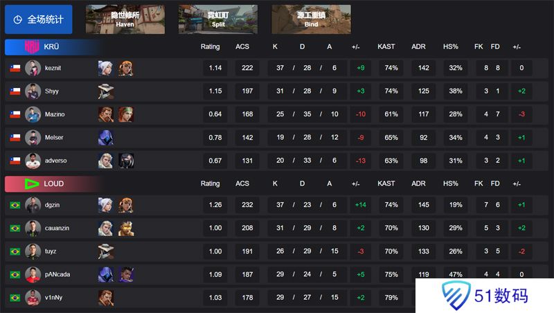 值得一提的是,在本场比赛中,LOUD战队的dgzin选手与KRU战队的keznit选手均发挥出色,两人并列拿到了全场最高的37总击杀。dgzin以其精准的枪法和冷静的判断力,多次在关键时刻为队伍打开局面;而keznit则凭借其出色的个人能力和不屈不挠的斗志,为KRU赢得了宝贵的分数。两位选手的精彩表现,无疑为这场对决增添了许多看点。