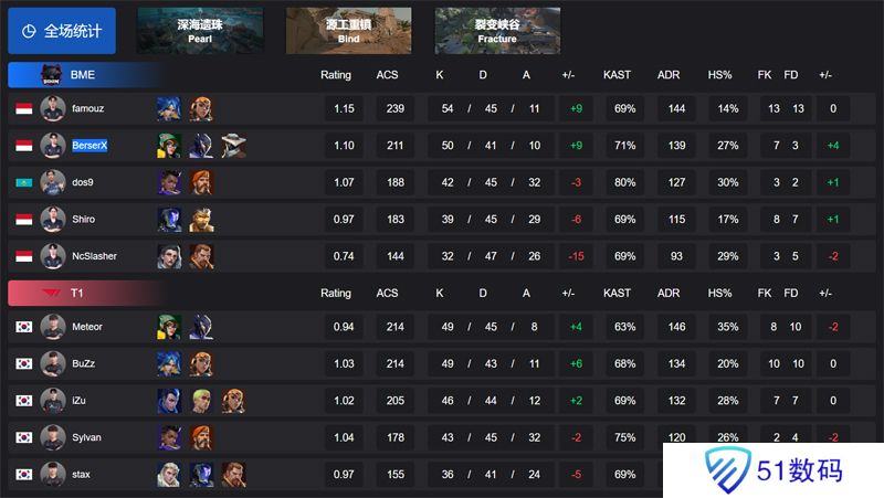 尽管来自BME战队的印尼选手famouz和BerserX分别砍下了54和50总击杀,位列全场比赛的头两名,但无奈T1选手的发挥更为平均,同时在地图的战术转变层面更加灵活,希望T1调整自己的状态迎接败者组的比赛。
